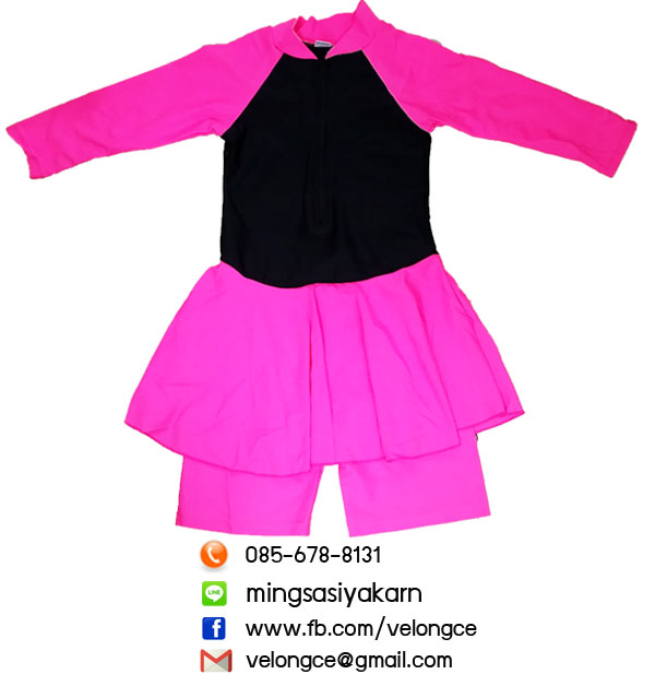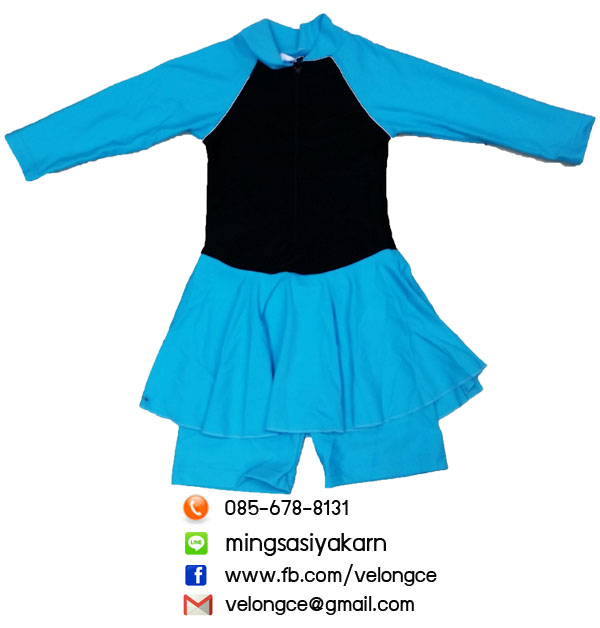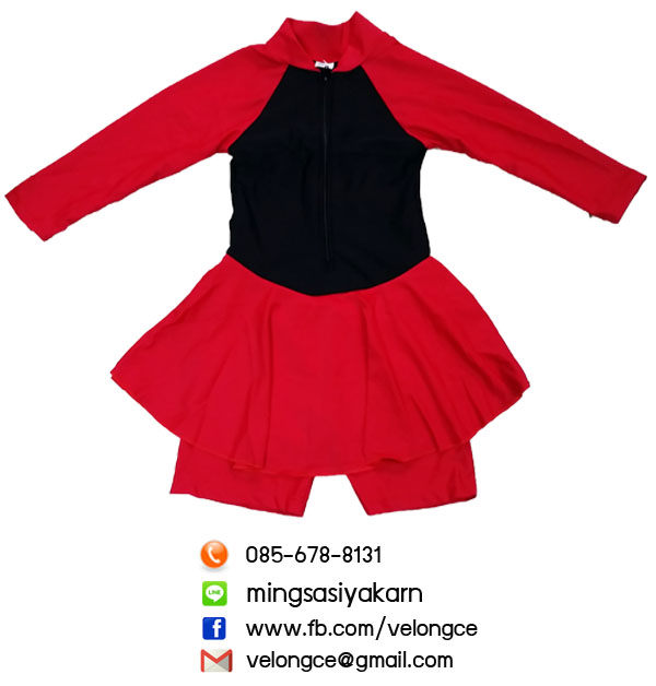 ชุดว่ายน้ำเด็กหญิง ชิ้นเดียวแขนยาวมีซิปสีพื้นมีกระโปรงคลุม พร้อมกางเกงขาสั้นด้านใน แถบสีแดง ฟ้า ชมพู