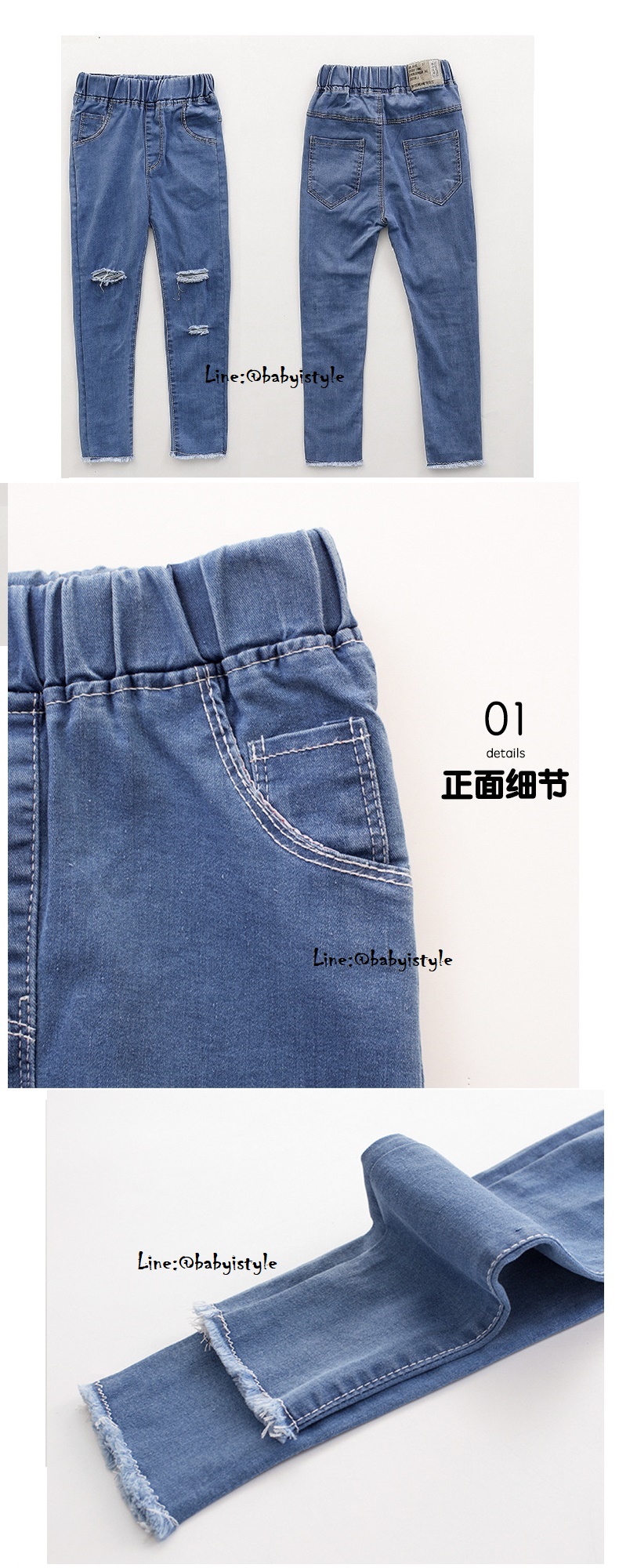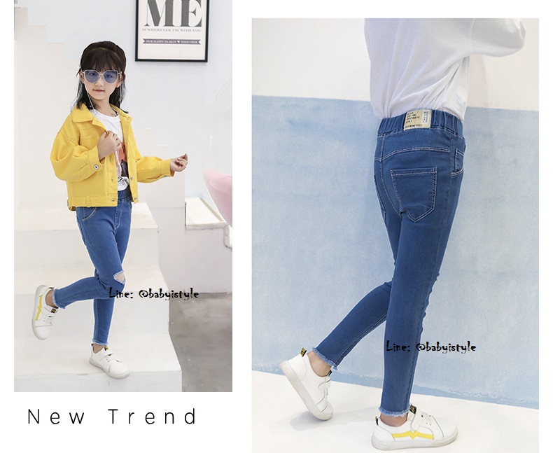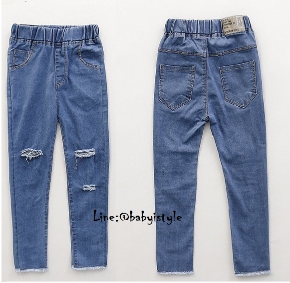 เด็กโต-กางเกงยีนส์เดนิม(ผ้านิ่ม) ขายาวเดฟแต่งขาดๆ เซอร์ๆ เอวยางยืด มีกระเป๋าหลัง งานสวยเก๋ ไซส์ 140/150/160