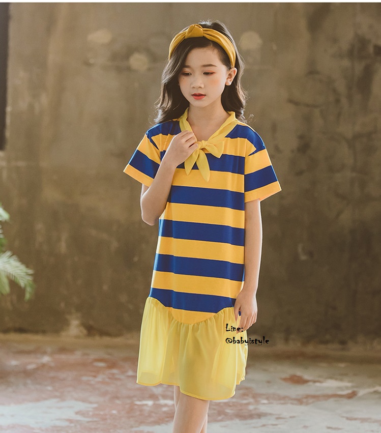 เด็กโต-เดรสแขนสั้นลายริ้วสีเหลือง-น้ำเงินผูกริบบิ้นชีฟองและชายต่อระบาย ผ้าดี สวยเก๋ ไซส์ 140/150/160/170