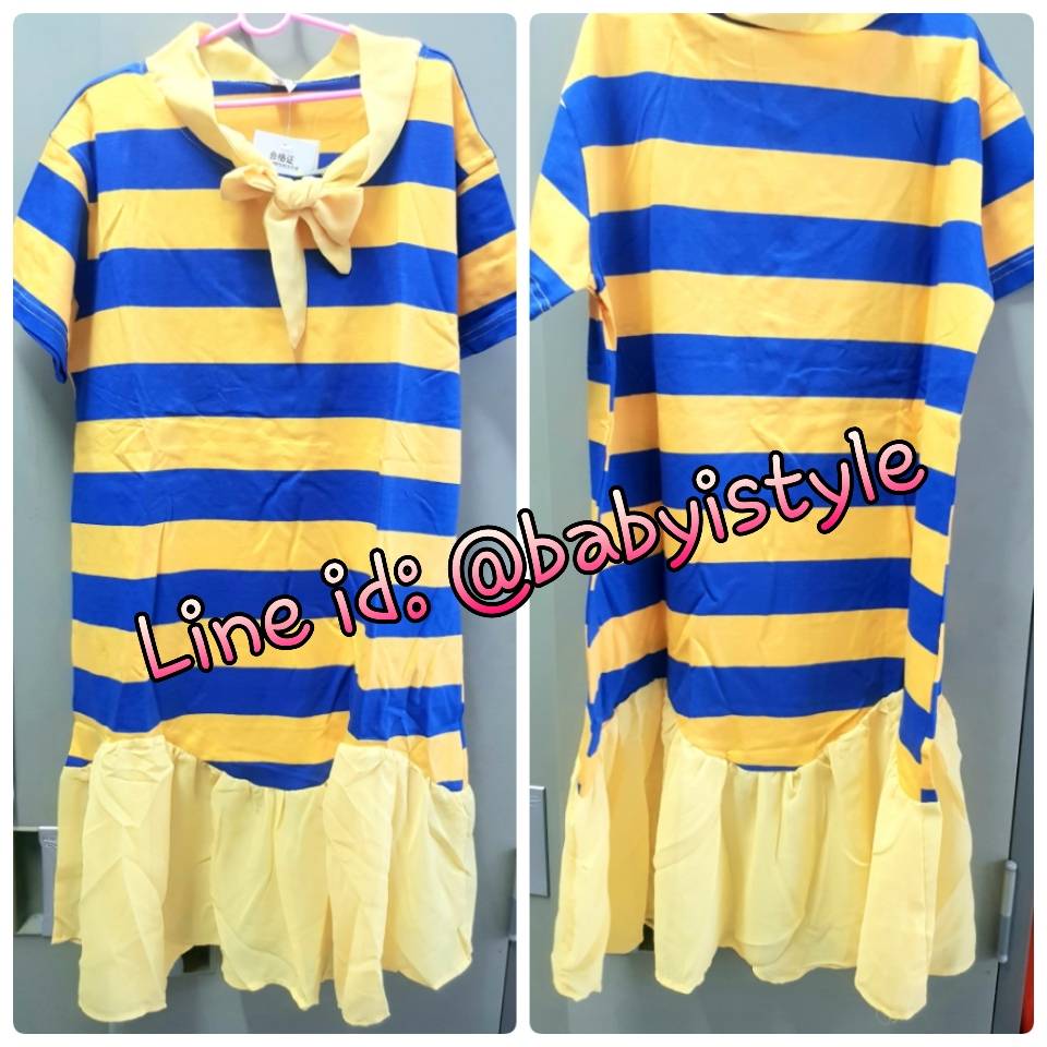 เด็กโต-เดรสแขนสั้นลายริ้วสีเหลือง-น้ำเงินผูกริบบิ้นชีฟองและชายต่อระบาย ผ้าดี สวยเก๋