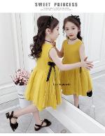 เด็กโต-เดรสแขนกุดทรงเอสีเหลืองมัสตาร์ด ด้านข้างแต่งผ้าโปร่งและริบบิ้นผูกโบว์สีดำ มีซิปหลัง ผ้าคอตตอน สวยเก๋