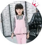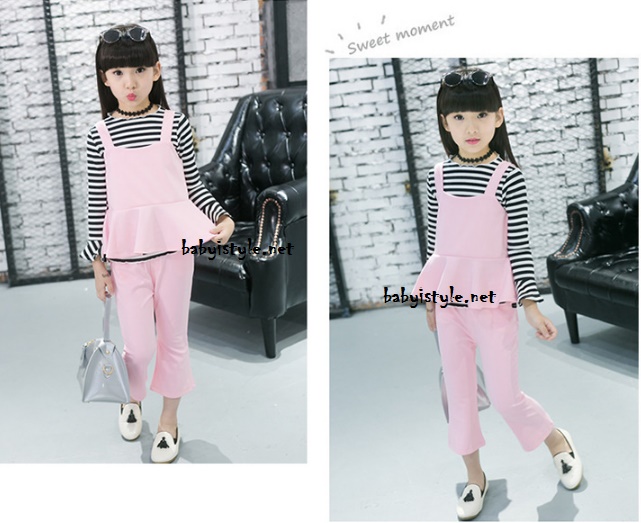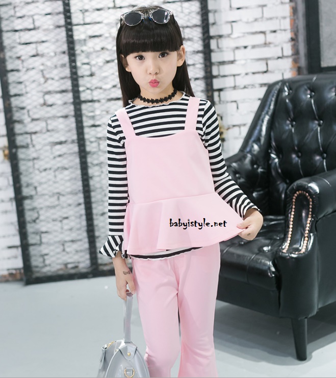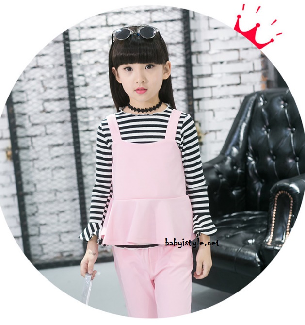 เด็กโต-ชุด3ชิ้นเสื้อริ้วสีขาวดำแขนยาวกระดิ่ง+เสื้อสายเดี่ยวชายระบายสีชมพู+กางเกงขายาวกระดิ่งสีชมพู มีกระเป๋า 2 ข้าง เอวยางยืด งานสวยเป๊ะเว่อร์ ไซส์ 140/150/160