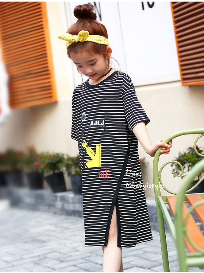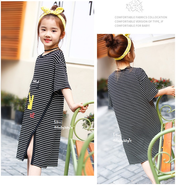 เด็กโต-เดรสแขนสั้นลายริ้วสีดำขาวLook2meทรงยาวผ่าหน้า ผ้ายืดหยุ่นได้ดี งานสวยคะ ไซส์ 130/140/150/160