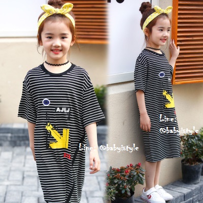 *Sales เด็กโต-เดรสแขนสั้นลายริ้วสีดำขาวLook2meทรงยาวผ่าหน้า ไซส์ 140 รหัส KKK683