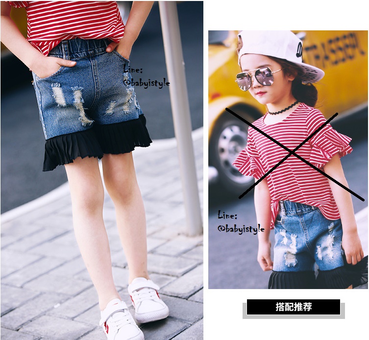 เด็กโต-กางเกงยีนส์ขาสั้นแต่งขาดๆ ชายแต่งผ้าชีฟองสีดำอัดพลีท ขอบเอวยางยืด มีกระเป๋าหลัง งานสวยเปรี้ยว ไซส์ 140/150/160