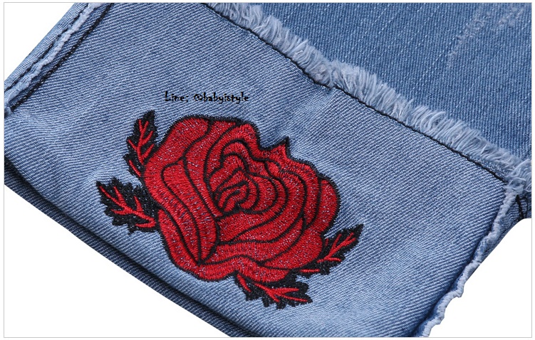 เด็กโต-กางเกงยีนส์ 4 ส่วนพับเบิ้ลปักดอกกุหลาบแดง ขอบเอวยางยืด มีกระเป๋าหลัง งานสวยน่ารัก ไซส์ 140/150/160