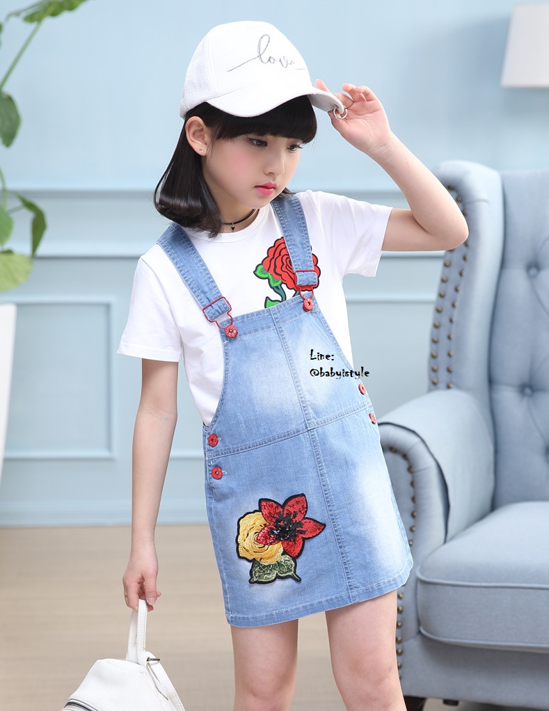 เด็กโต-เฉพาะเอี๊ยมกระโปรงยีนส์เทียม(บาง) ปักดอกไม้แดง มีกระเป๋าหลัง สายปรับได้ งานสวยน่ารัก