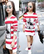 *Sales เด็กโต-เดรสแขนยาวลายริ้วสีแดง ลายสาวเปรี้ยว ชายผ่าข้าง ไซส์ 140 รหัส KKK449A
