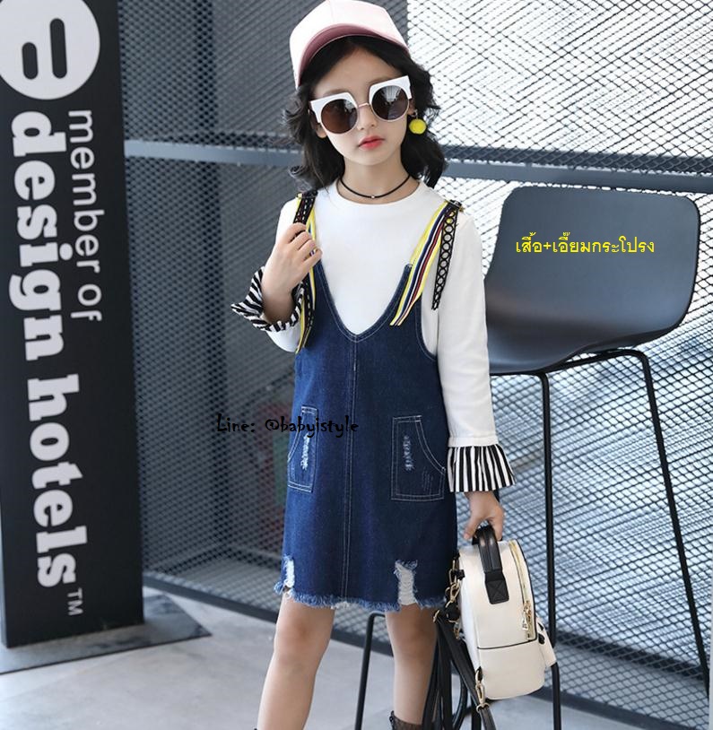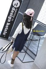 เด็กโต-เอี๊ยมกระโปรงยีนส์ แต่งขาดๆเซอร์ๆ สายเอี๊ยมซ้อน 2 แบบปรับได้ มีกระเป๋าหน้า-หลัง สวยเท่ห์ ไซส์ 150