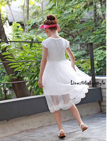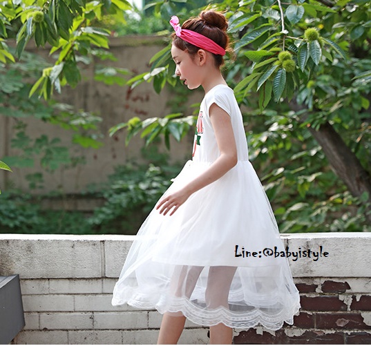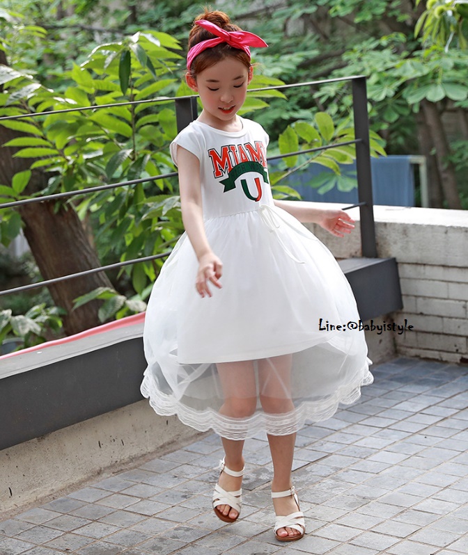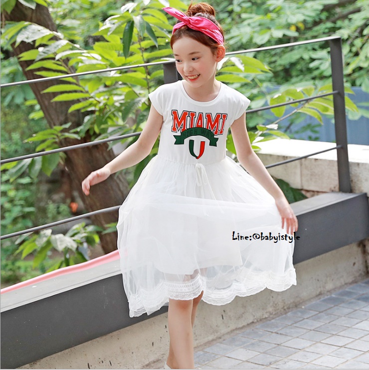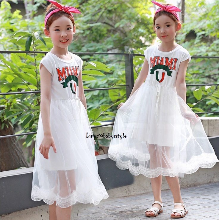 เด็กโต-เดรสยาวพรีเมี่ยมสีขาวแขนล้ำสกรีน MIAMIต่อกระโปรงผ้ามุ้งสีขาวชายลูกไม้ งานสวยเริ่ด ไซส์ 130/140/150