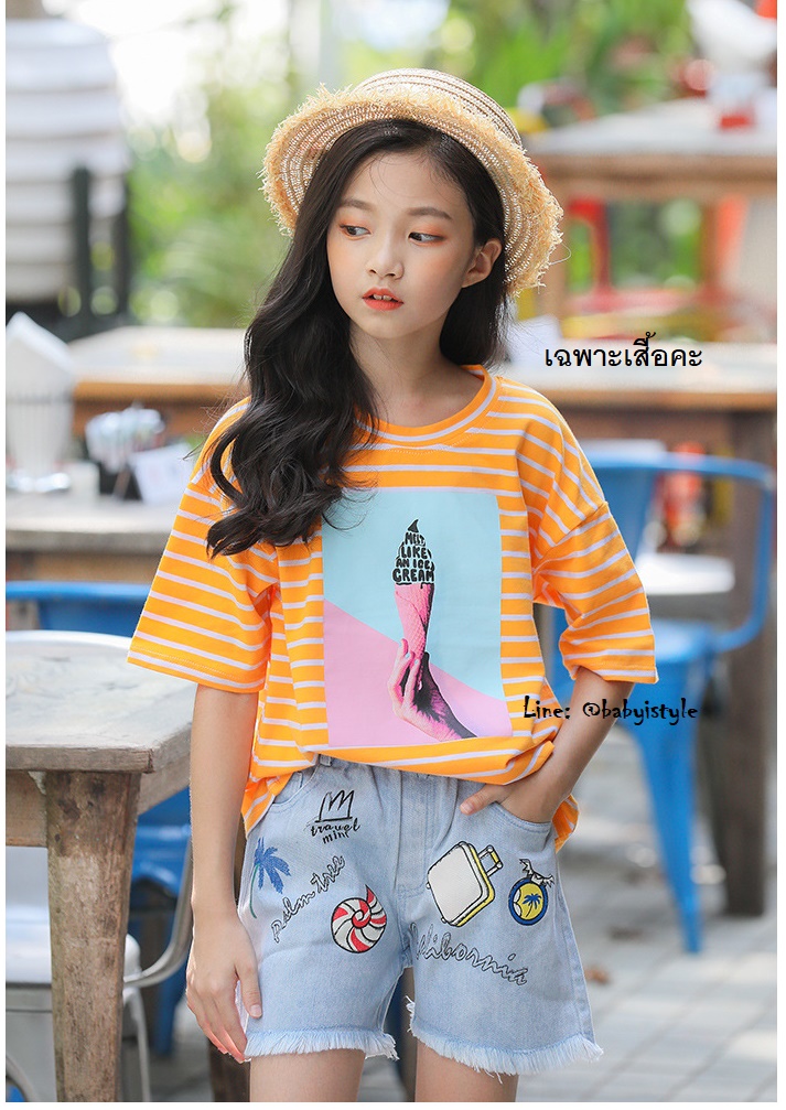 เด็กโต-เสื้อครอปแขนสั้นลายริ้วสีส้มสกรีนICE CREAM ผ้าดียืดหยุ่นได้ (ไม่รวมกางเกง) ไซส์ 140/150/160/170