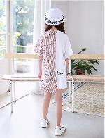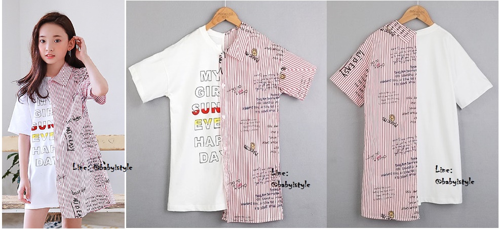 เด็กโต-เดรสแขนสั้น 2 สไตล์คอยืดสีขาว+คอเชิ้ตลายริ้วแดง สกรีนอักษร แต่งกระดุม(เม็ดบนสุดแกะได้)