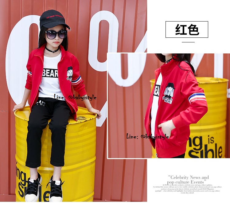 เด็กโต-ชุด2ชิ้นเสื้อแจ็คเก็ตคอตั้งแขนยาวจั๊มพ์สีแดงปักสาวFashionable มีกระเป๋าข้าง (ไม่มีเสื้อตัวใน)