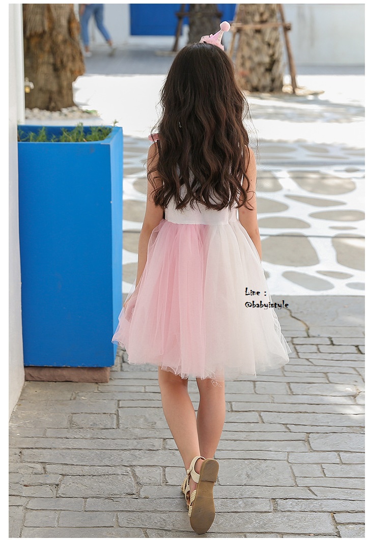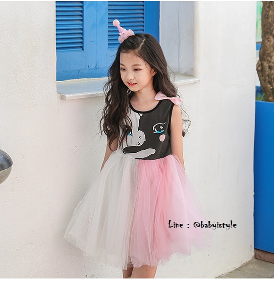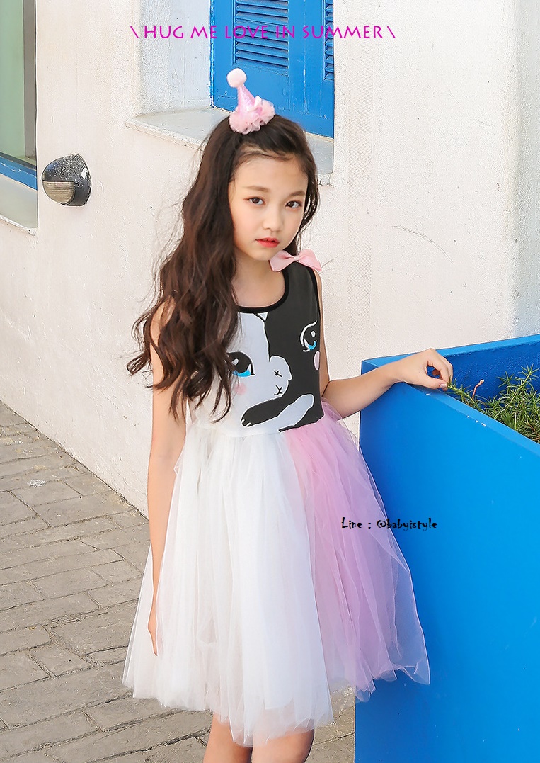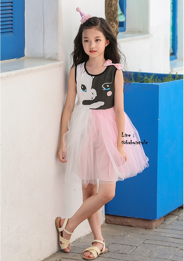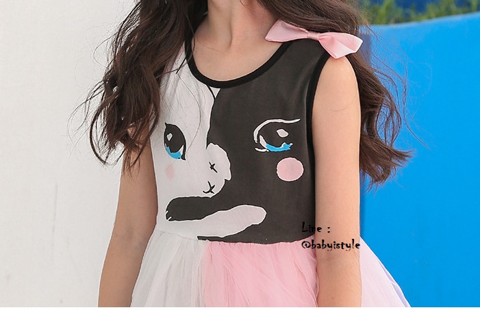 เด็กโต-เดรสแขนกุดสีขาวลายแมวเหมียวติดโบว์ที่บ่า ช่วงเสื้อผ้ายืดหยุ่นได้ เอวยางยืด ช่วงกระโปรงผ้าตาข่าย 4 ชั้นฟูฟ่องสีชมพู-ขาว มีซับใน งานสวยน่ารักมาก ไซส์ 140/150/160