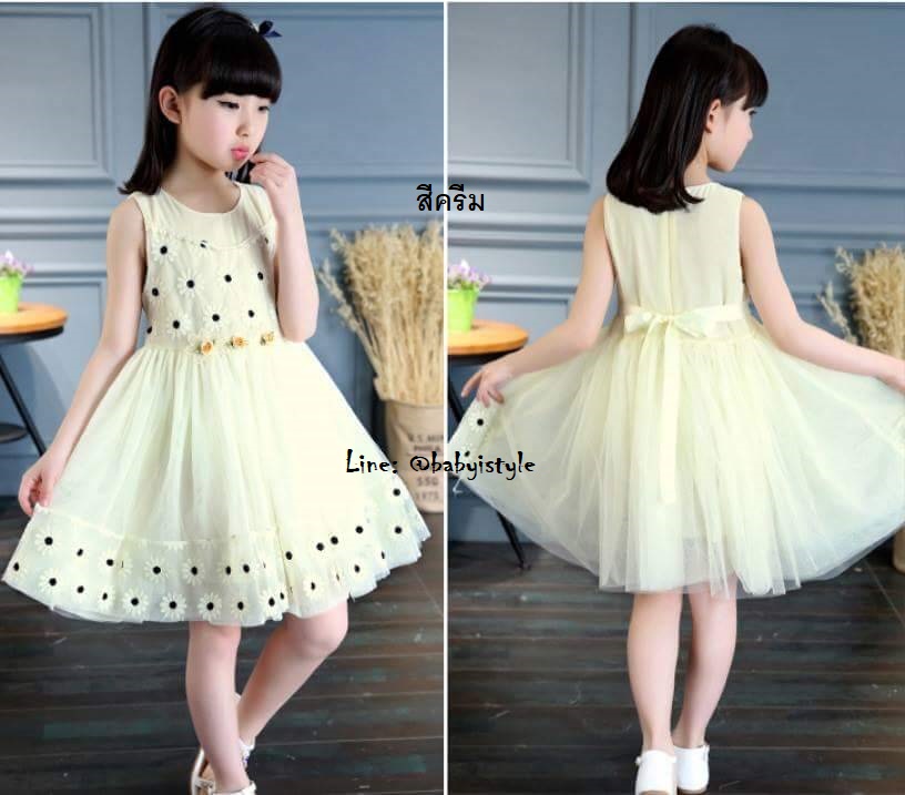 เด็กโต-เดรสแขนกุดสีครีมปักลายดอกทานตะวัน ผูกริบบิ้นหลังสีครีม กระโปรงผ้าตาข่าย2ชั้น มีซับในทั้งชุด ซิปหลัง งานสวยน่ารักมาก ไซส์ 140/150/160