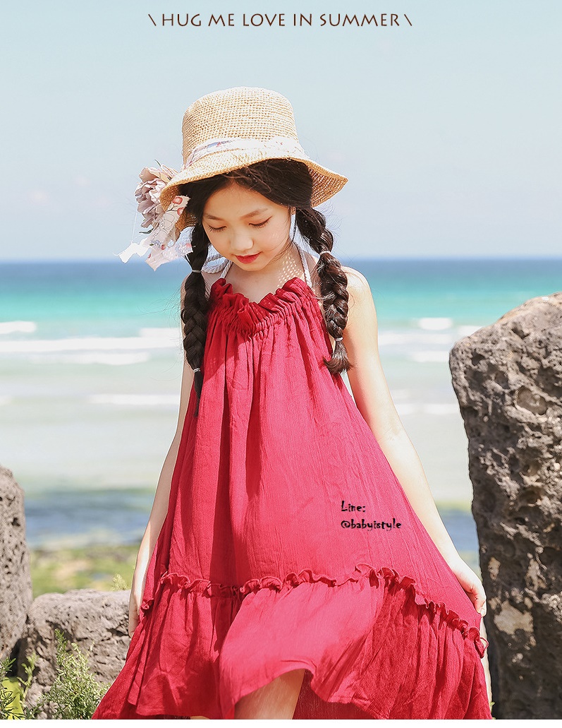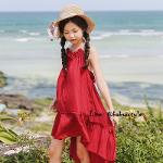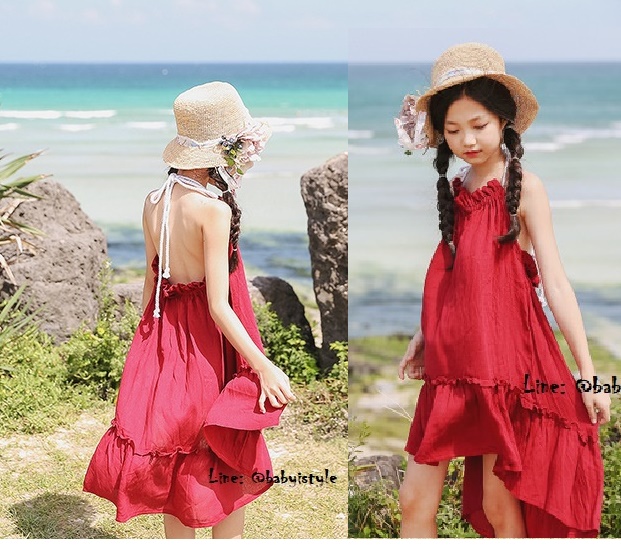 *Sales เด็กโต-เดรสสายเดี่ยวสีแดงเลือดนกผูกสายคล้องคอไปด้านหลังไซส์140/150/160รหัสKKK908B