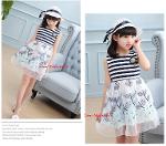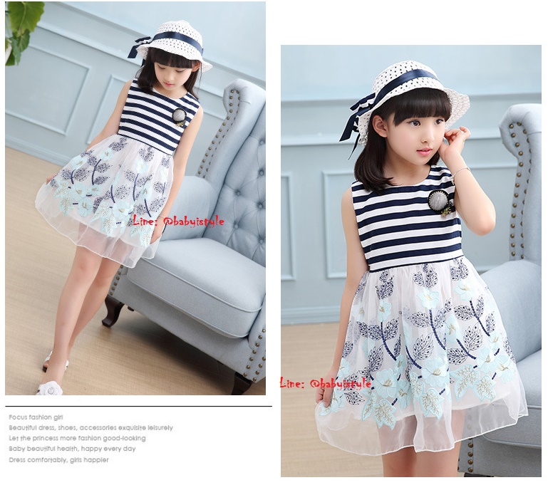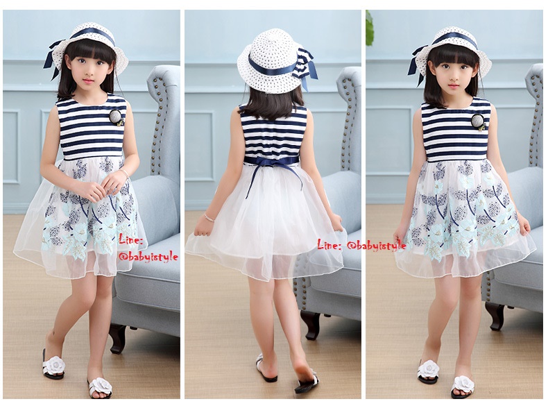 เด็กโต-ชุด 3 ชิ้นเดรสแขนกุดลายริ้วสีกรม-ขาวต่อกระโปรงผ้าแก้วปักดอกไม้โทนสีฟ้า+หมวกสีขาว+ติดเข็มกลัด ผูกริบบิ้นด้านหลัง มีซับใน งานสวยน่ารักมาก ไซส์ 140/150/160
