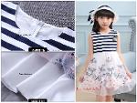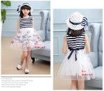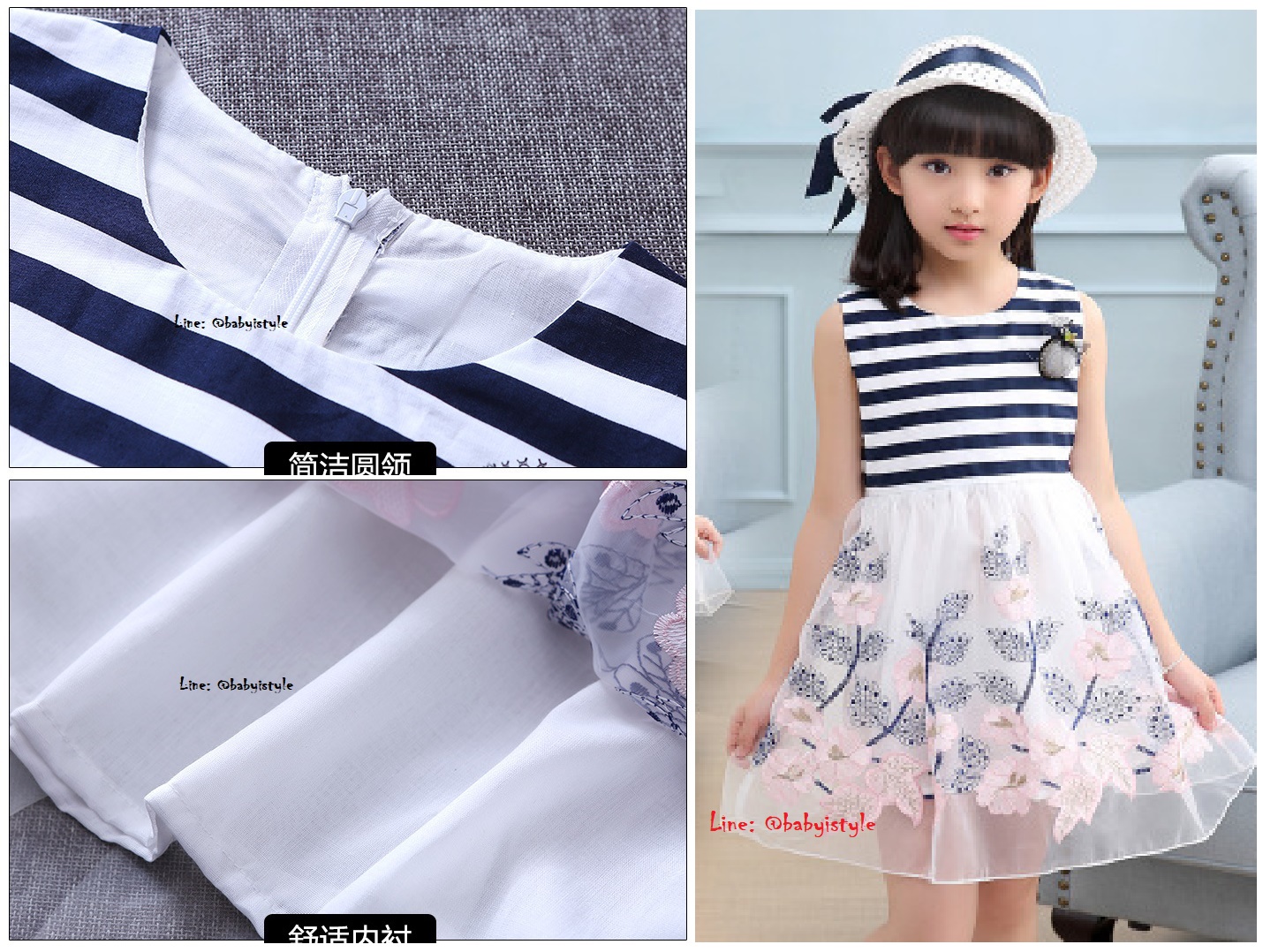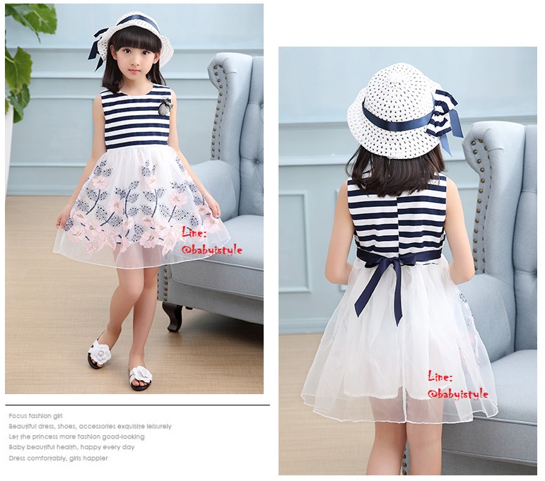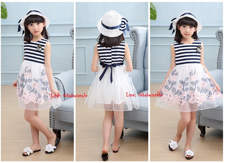 เด็กโต-ชุด 3 ชิ้นเดรสแขนกุดลายริ้วสีกรม-ขาวต่อกระโปรงผ้าแก้วปักดอกไม้โทนสีชมพู+หมวกสีขาว+ติดเข็มกลัด ผูกริบบิ้นด้านหลัง มีซับใน งานสวยน่ารักมาก ไซส์ 140/150/160