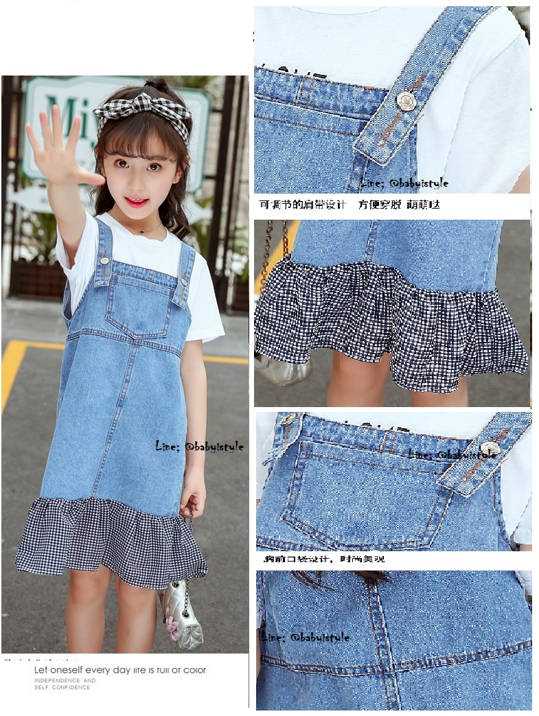 +เอี๊ยมกระโปรงยีนส์ชายต่อผ้าสก็อตสีดำ มีกระเป๋า สายเอี๊ยมแบบติดกระดุมได้ 2 ตำแหน่ง งานสวยน่ารัก