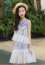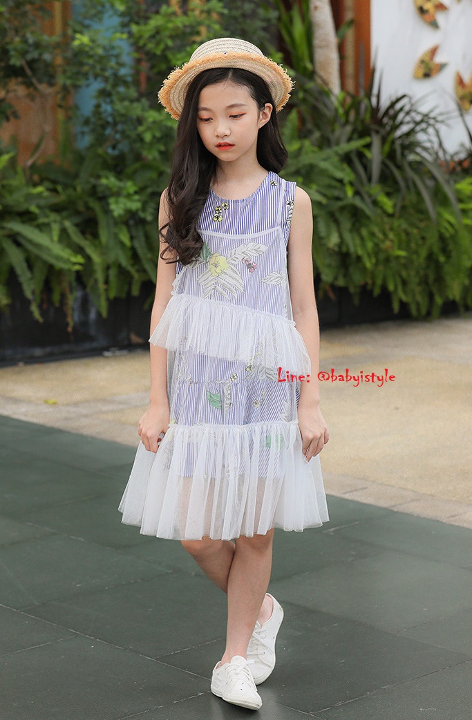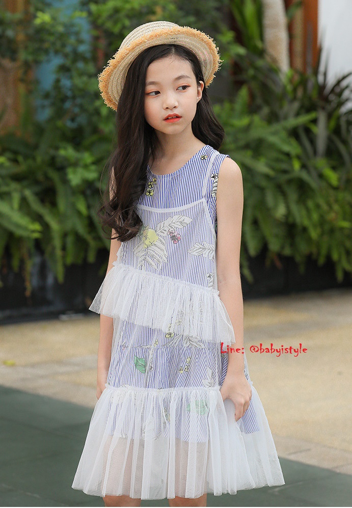 เด็กโต-ชุด 2 ชิ้น เดรสแขนกุดใบไม้ลายริ้วสีน้ำเงิน ชายระบาย ผูกโบว์แดงปกหลัง+เดรสสายเดี่ยวผ้าโปร่งตาข่ายสีขาว งานสวยน่ารัก ไซส์ 140/150/160