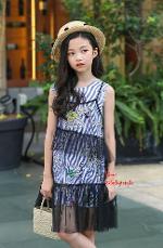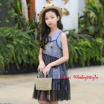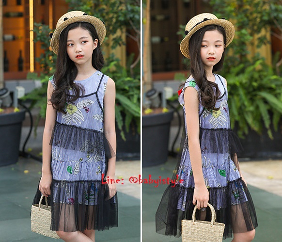 เด็กโต-ชุด 2 ชิ้น เดรสแขนกุดใบไม้ลายริ้วสีน้ำเงิน ชายระบาย ผูกโบว์แดงปกหลัง+เดรสสายเดี่ยวผ้าโปร่งตาข่ายสีดำ งานสวยน่ารัก ไซส์ 140/150/160