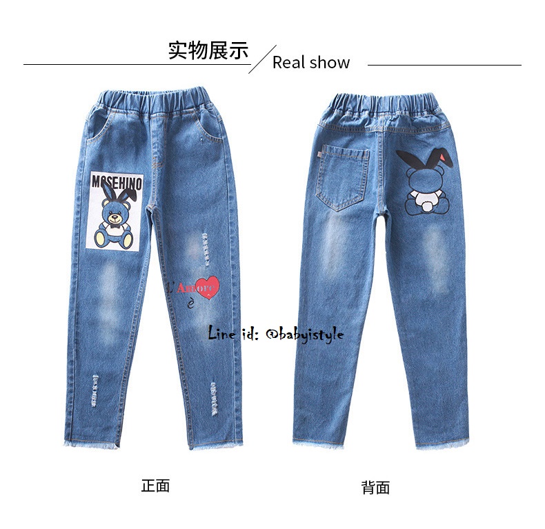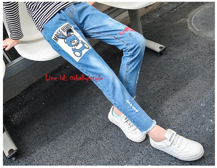 เด็กโต-กางเกงยีนส์ขายาวเดฟสกรีนหมี สกิดขาดนิดๆ ชายปล่อย เอวยางยืด มีกระเป๋าหน้า-หลัง งานสวยเก๋ (ผ้าไม่ยืดนะค่ะ) ไซส์ 140/150/160