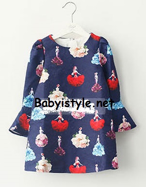 เดรสสั้นสีน้ำเงิน ผ้าลายสาวน้อยกระโปรงฟูฟ่อง แขนยาวกระดิ่ง ไซส์ 100/110/120/130/140