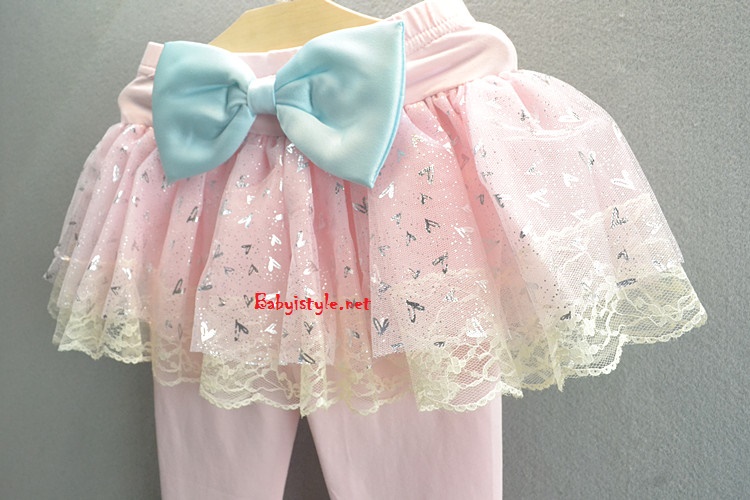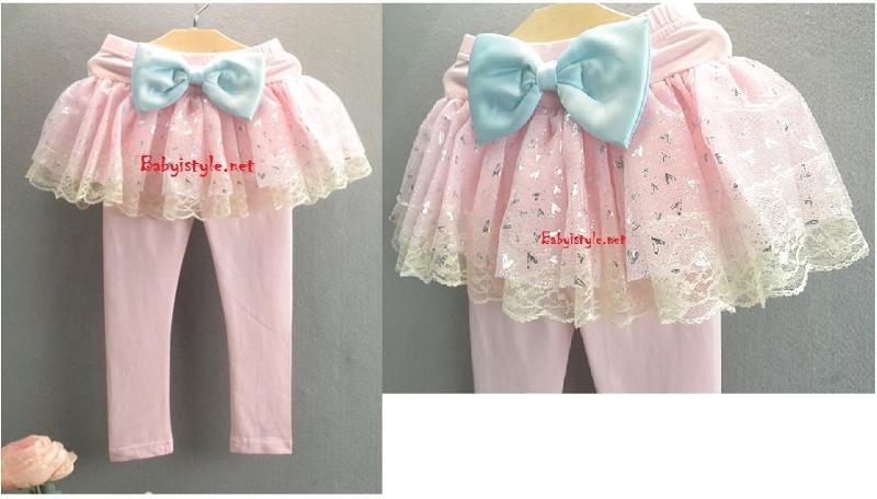 เลกกิ้งกระโปรงขายาวสีชมพู แต่งระบายผ้าตาข่ายและลูกไม้ ติดโบว์ใหญ่