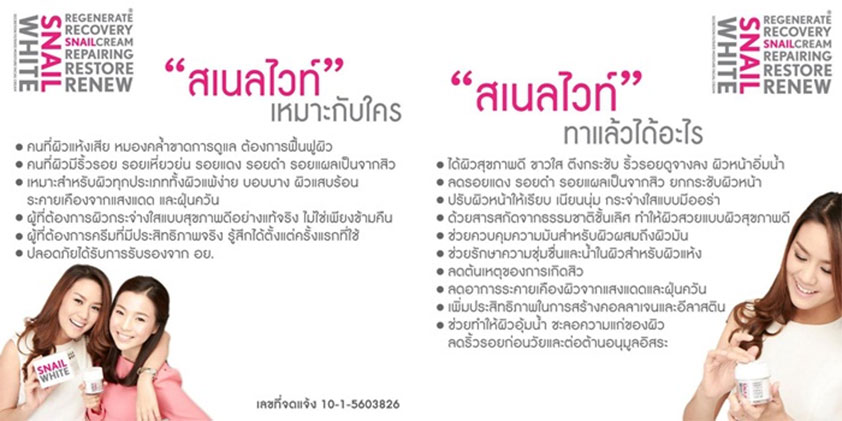ครีมหอยทากขาว ตบแล้วใส ใฃ้แล้วตึง ลดริ้วรอย ลดอาการแพ้ผื่นคัน ลดการอักเสบของสิว ลดริ้วรอย ผิวขาวใส รักษารอยแผลเป็น รอบดำ รอยแดงให้จางลง โดยลดการสร้างเนื้อเยื้อแผลเป็น กระตุ้นสมานแผล ยกกระชับใบหน้า ,