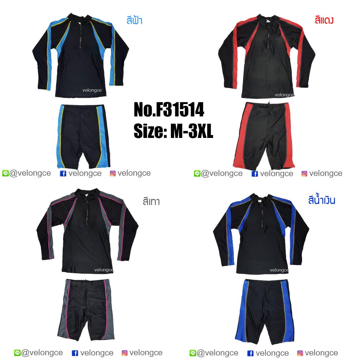 F31514 ชุดว่ายน้ำสปอร์ต 2 ชิ้น แขนยาวคู่กางเกงขาสั้น Size M-L-XL-XXL-3XL มีแถบสีเทา ฟ้า น้ำเงิน แดงและชมพู