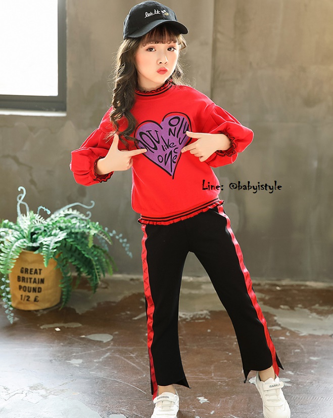 เด็กโต-ชุด2ชิ้นเสื้อแขนยาวจั๊มพ์สีแดงสกรีนหัวใจYou live only oneช่วงไหล่จับจีบ+กางเกงทรงขาม้ายาวสีดำ แต่งแถบSupremeด้านข้าง เอวยางยืด ผ้าดีมากๆ งานสวยน่ารัก ไซส์140/150/160