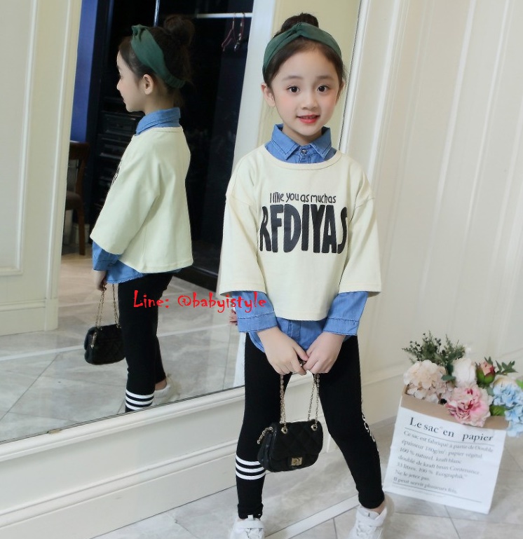 เด็กโต-ชุด3ชิ้นเสื้อแขน3ส่วนสีครีมI like you as muchas RFDIYAS+เสื้อเชิ้ตยีนส์แขนยาวแบบบาง+เลกกิ้งขายาวสีดำสกรีนอักษร เอวยางยืด ผ้าดีมากๆ งานสวยน่ารัก ไซส์ 140/150/160
