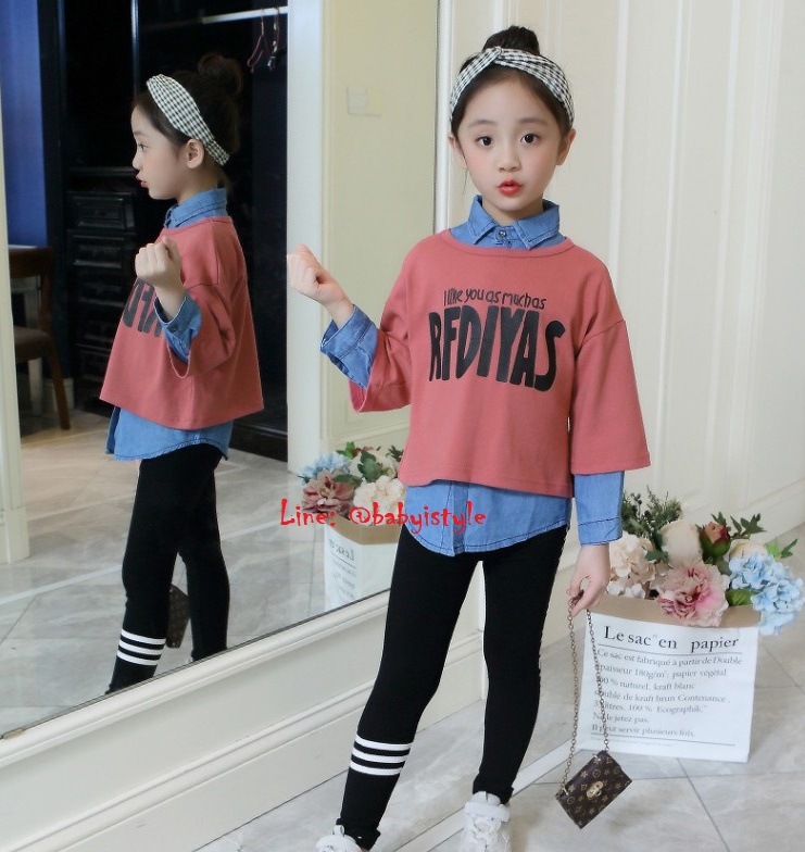 เด็กโต-ชุด3ชิ้นเสื้อแขน3ส่วนสีแดงอมชมพู I like you as muchas RFDIYAS+เสื้อเชิ้ตยีนส์แขนยาวแบบบาง+เลกกิ้งขายาวสีดำสกรีนอักษร เอวยางยืด ผ้าดีมากๆ งานสวยน่ารัก ไซส์ 140/150