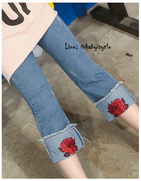 เด็กโต-กางเกงยีนส์ 4 ส่วนพับเบิ้ลปักดอกกุหลาบแดง ขอบเอวยางยืด มีกระเป๋าหลัง งานสวยน่ารัก ไซส์ 140/150/160