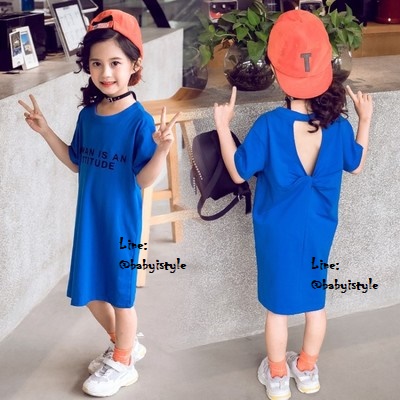 Sales เด็กโต-เดรสแขนสั้นสีน้ำเงินสกรีนAUMAN IS AN ATTITUDEหลังเว้าหยดน้ำไซส์140/150/160รหัสKKL069B