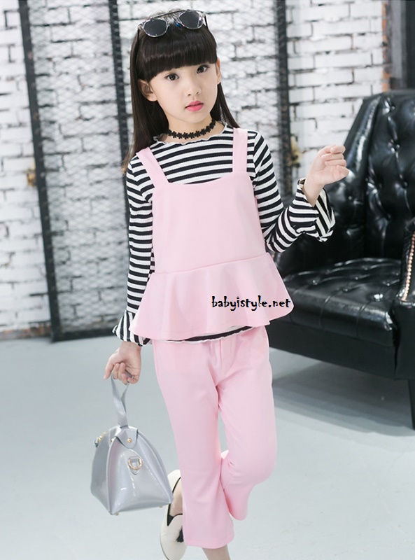 เด็กโต-ชุด3ชิ้นเสื้อริ้วสีขาวดำแขนยาวกระดิ่ง+เสื้อสายเดี่ยวชายระบายสีชมพู+กางเกงขายาวกระดิ่งสีชมพู มีกระเป๋า 2 ข้าง เอวยางยืด งานสวยเป๊ะเว่อร์ ไซส์ 140/150/160