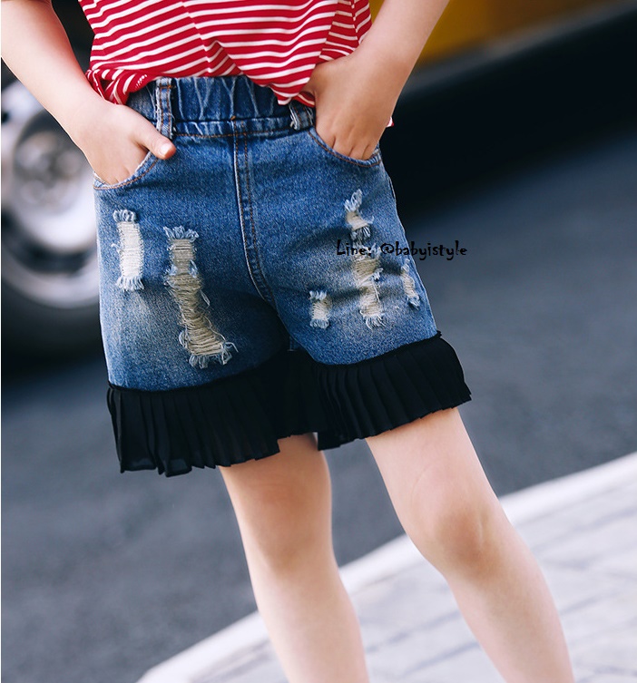 เด็กโต-กางเกงยีนส์ขาสั้นแต่งขาดๆ ชายแต่งผ้าชีฟองสีดำอัดพลีท ขอบเอวยางยืด มีกระเป๋าหลัง งานสวยเปรี้ยว ไซส์ 140/150/160