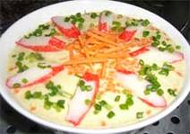 เครื่องปรุง - ไข่ไก่(เบอร์ 1) 3 ฟอง - น้ำเปล่า - ปูอัด 3-4 แท่ง(หั่นแทยง) - แครอทหั่นลูกเต๋าเล็ก 2 ช้อนโต๊ะ , หั่นแท่งเล็กน้อย - ต้นหอมซอย - ซิอิ๊วขาว 1 ช้อนโต๊ะ - ซอสปรุงรส 2 ช้อนชา - น้ำปลา 1/2 ช้อนโต๊ะ ใส่น้ำในลังถึง จากนั้นนำลังถึงตั้งไฟ ระหว่างรอน้ำเดือด ตอกไข่ใส่ชาม ใช้ซ่อมตีไข่ให้ไข่แดงและไข่ขาวเข้ากัน ปรุงรสด้วย ซิอิ๊วขาว ซอสปรุงรส และน้ำปลา จากนั้นค่อยๆ เติมน้ำเปล่าลงไป คนให้เข้ากัน ใส่ปูอัดและแครอท ที่หั่นเตรียมไว้ส่วนหนึ่งลงในชาม แบ่งไว้ส่วนหนึ่ง เอาไว้แต่งหน้า จากภาพจะเห็นแครอทลอยอยู...